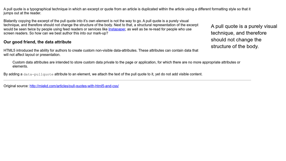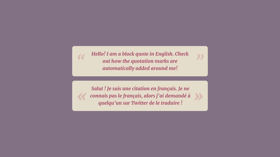 See the Pen Pull-quote with shape-outside by Abbey Fitzgerald abbeyjfitzgerald on CodePen. Every now and then it offers you head butts and scours against you. So you can just wrap your text in the proper tag and itll automatically style it with quotations.